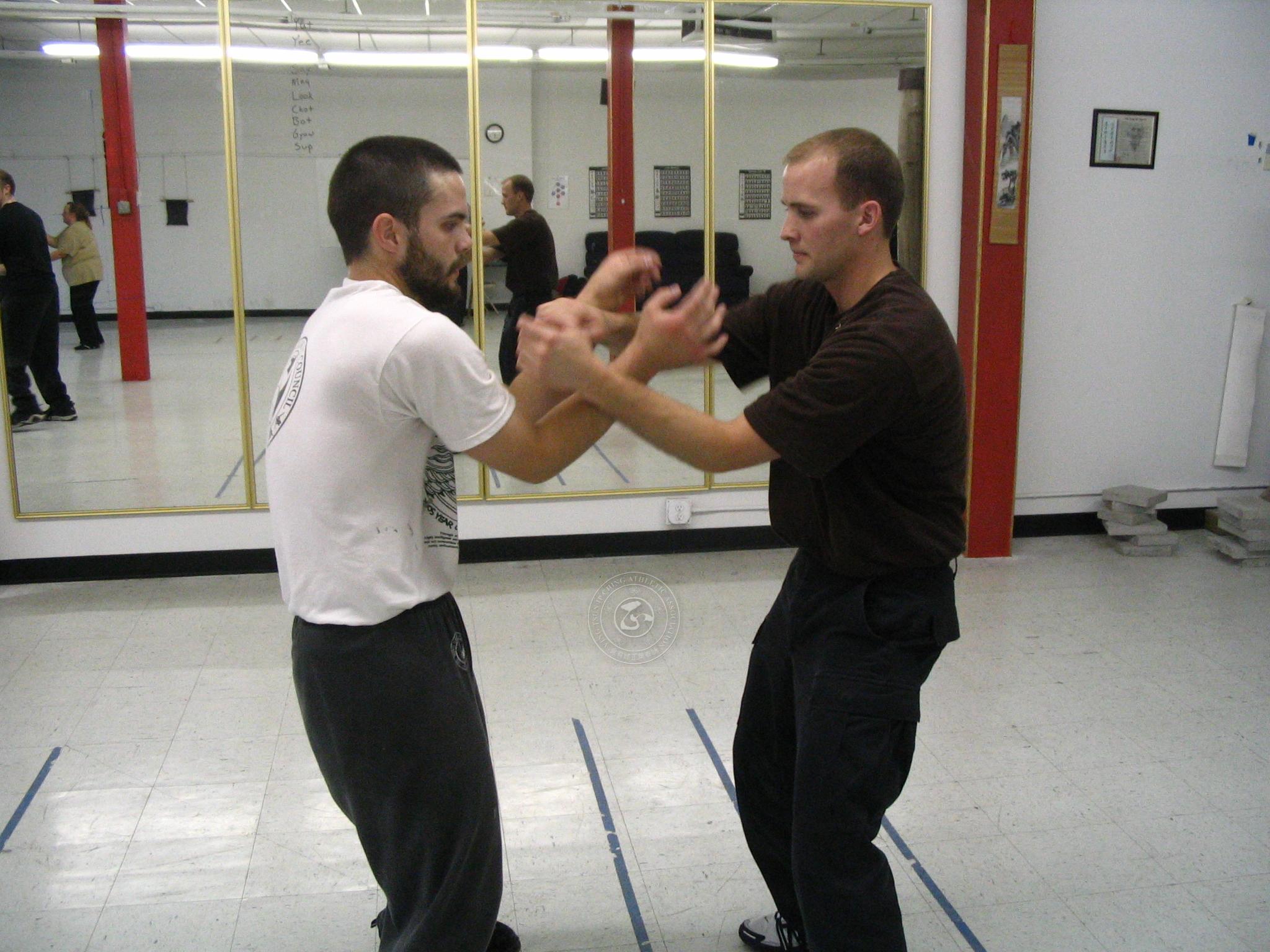 Jo Gau Tom Stafford plays chi sao with student.